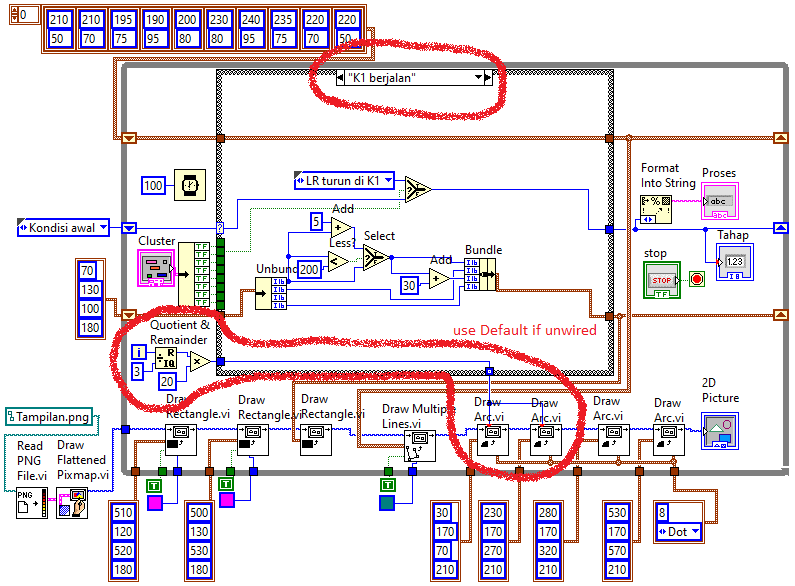 4. Sama seperti langkah no. 3 di atas, agar 2 Roda Konveyor K2 hanya berputar ketika keadaan “K2 berjalan”, maka buat agar garis data dari Quotient & Remainder ke kaki input start angle melewati Case Structure di Case “K2 berjalan”. Kemudian klik kanan pada kotak kecil di dinding Case Structure, pilih Use Default if Unwired.